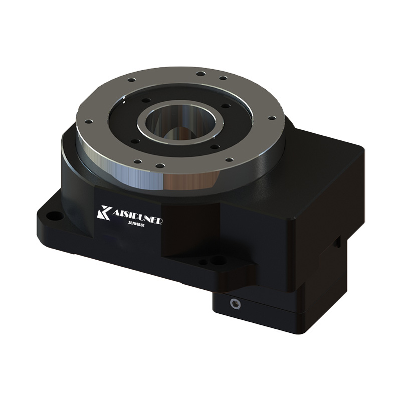 伺服中空旋转平台的特点: 这款中空旋转平台的齿轮采用螺旋设计,达2级齿轮精度,经氮化处理,硬度可达HRC52,可以承受盘面侧向力臂负载!